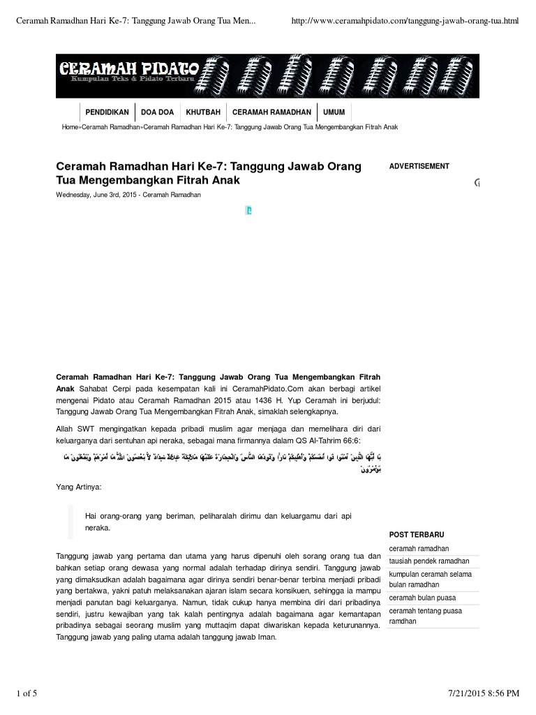 Ceramah Ramadhan Hari Ke 7 Tanggung Jawab Orang Tua Mengembangkan Fitrah Anak Ceramah Pidato