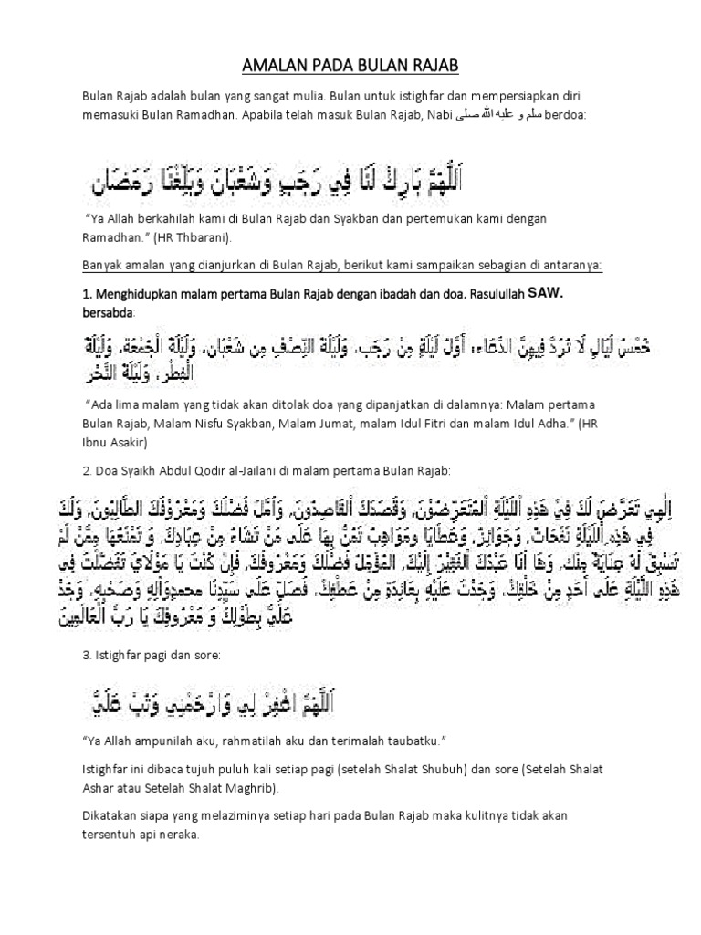 Sebagaimana dalam firman Allah SWT dalam Surat At Taubah ayat 36 yang berbunyi. Doa Bulan Rajab Lengkap Arab dan Latin serta Artinya agar Mendapat Cucuran Rahmat Kastolani Selasa 09 Februari 2021 - 181900 WIB Muslim dianjurkan memanjatkan doa menyambut Bulan Rajab agar mendapat cucuran rahmat Allah SWT. Pada bulan Rajab terdapat amalan-amalan seperti.