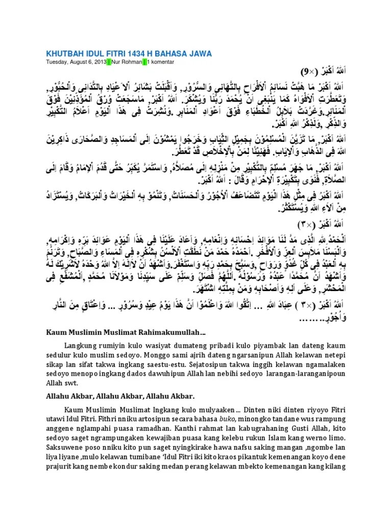 Nembe mawon kita ruku lan sujud minangka wujud taat kita dateng allah swt. Khutbah Idul Fitri Bahasa Jawa. الله اكبر كبيرا والحمد لله كثيرا وسبحان الله بكرة وأصيلا لا اله الا الله.