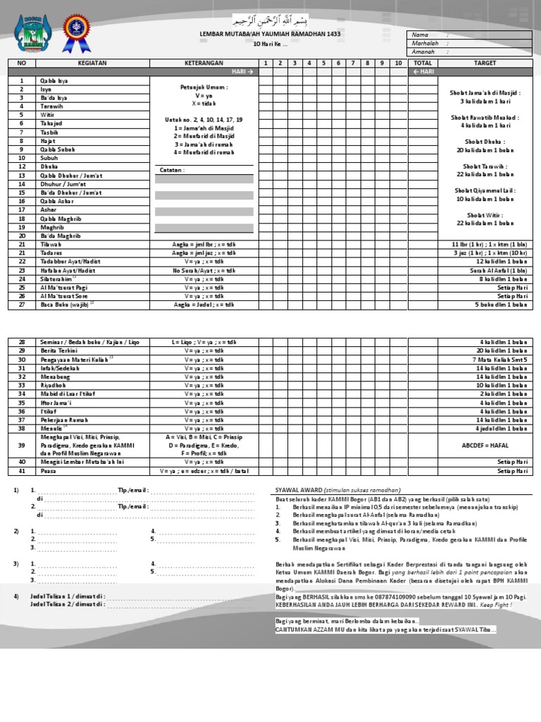 The OWNER SRI RAHMI 737109 420171 0005 BTN Paropo Blok C-13 Jl. Jadi ini adalah program evaluasi untuk mengontrol agenda dan target ibadah harian kita selama satu bulan. Lembar Mutabaah Yaumiyah Ramadhan.