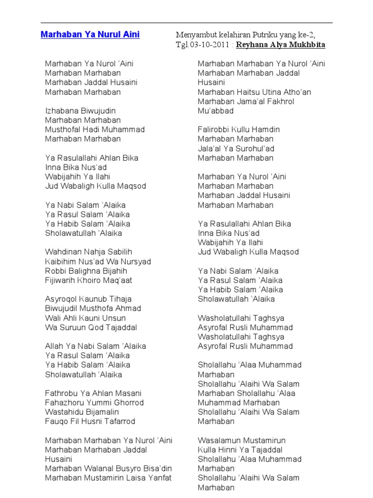 Lirik Lagu Marhaban ya Nurul Aini Habib Lirik lagu. Marhaban Ya Nurol Aini Marhaban Marhaban Marhaban Jaddal Husaini Marhaban Marhaban Izhabana Biwujudin Marhaban Marhaban Musthofal Hadi Muhammad Marhaban Marhaban Ya Rasulallahi Ahlan Bika Inna Bika Nusad Wabijahih Ya Ilahi Jud Wabaligh Kulla Maqsod Ya Nabi Salam Alaika Ya Rasul Salam Alaika Ya. Nurul musthofa nurul musthofa mala al-akwaan mala al-akwaan habibi muhammad muhammad muhammad khoiril mursalin allahul jalal athokal jamal allahul jalal athokal jamal ya syamsal kamal.