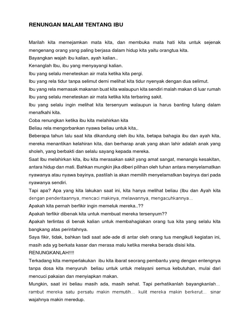 Begitu banyak kasih sayang yang engkau rasakan tapitak pernah ada kata syukur terucap dari mulut indah yang berlumurkan dosa. Dia telah memilih bagi-Nya seorang yang dikasihi-Nya. Dan disini saya memberi judul kata kata renungan tentang ibu yang mengharukan.