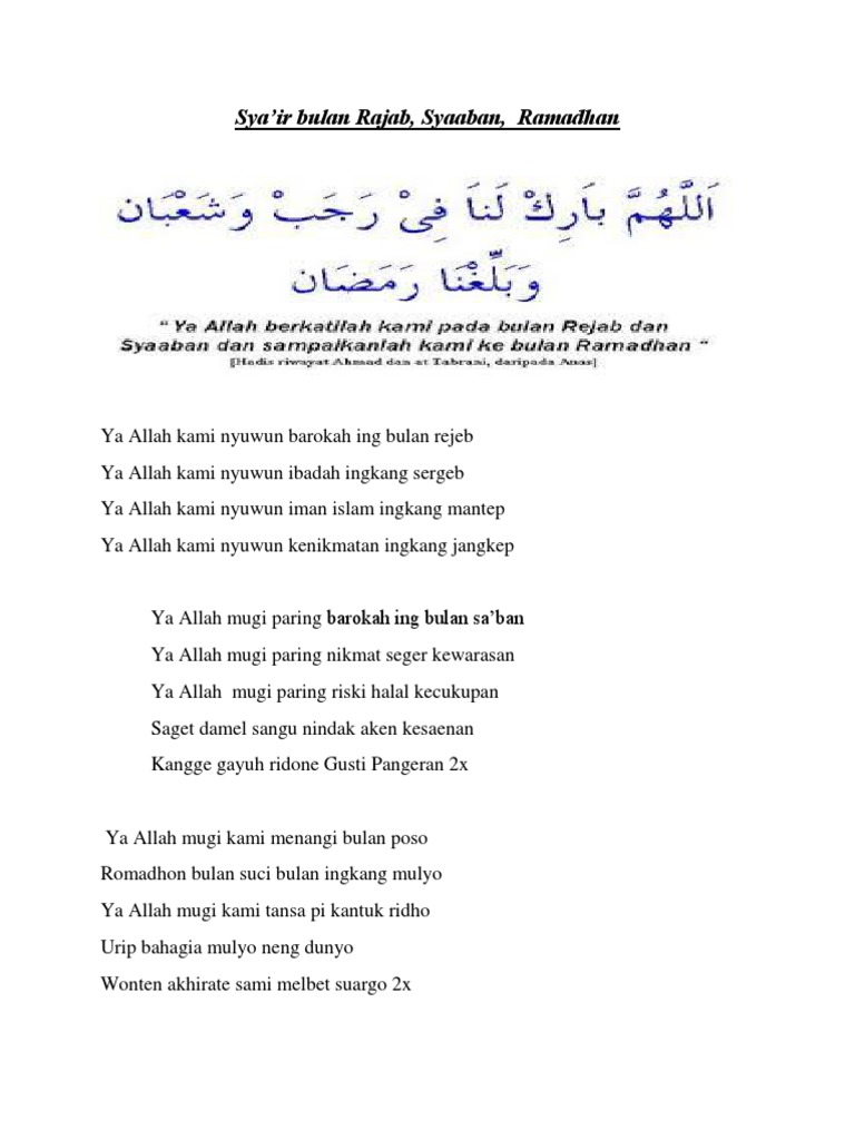Bagi umat Islam bulan Rajab. 2x WA SYABÃNA WA BALLIGHNÃ ROMADHÕNA. Sholawat doa rajab lirik text doa bahasa jawa.