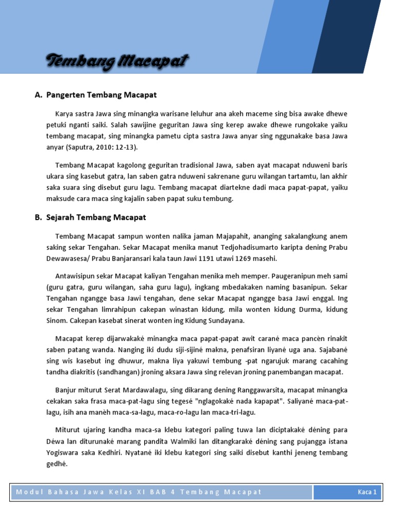 Tembang Macapat Iku Kaiket Ing Paugeran - Rajin Belajar Tembang macapat iku kaiket ing telung paugeran kajaba - Indonesia. Kayadene tembang tengahan tembang macapat uga kaiket ing guru lagu lan guru wilangan lan duwe watak dhewe-dhewe. View bu sri bahasa daerahdocx from PROJECT MA 7020 at University of Notre Dame.