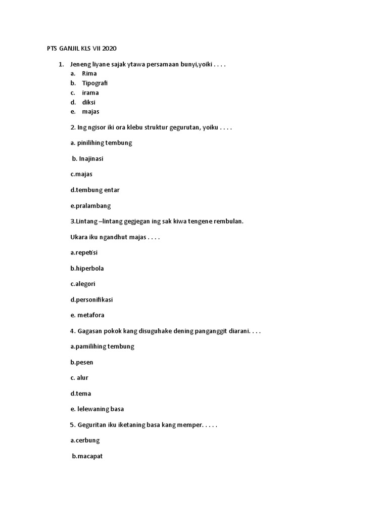 Wangsulana pitakon ing ngisor iki kanthi cara milih jawaban kang wis sumadya kang paling bener. 5 Paugeran Tembang Macapat Beserta Contoh dan Penjelasan Daftar Paugeran Tembang Macapat. Tembang macapat iki ana kang ngarani yen.