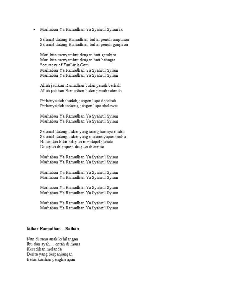 Selamat datang Ramadhan bulan penuh ampunan. Marhaban Ya syahraRamadhan Ya Syahrul Syiam Marhaban Ya syahraRamadhan Ya Syahrul Syiam Allah jadikan Ramadhan bulan penuh berkah Allah jadikan Ramadhan bulan penuh rahmah Perbanyaklah ibadah jangan lupa sedekah Perbanyaklah tadarus jangan lupa shalawat Marhaban Ya syahraRamadhan Ya Syahrul Syiam Marhaban Ya syahraRamadhan Ya Syahrul Syiam. Selamat datang wahai Ramadhan Selamat datang wahai bulan Ibadah.