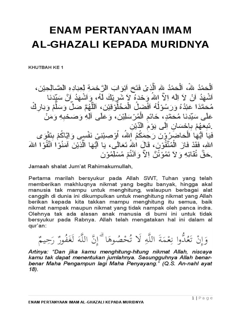 Jumat 25112016 Enam Pertanyaan Imam Al Ghazali Kepada Muridnya