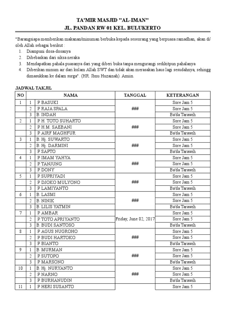 Shift 3 shift 2 shift 1. Yuk kreasikan sendiri takjil buka puasa di rumah yang praktis dan nikmat berikut ini. JADWAL PEMBAWA TAKJIL MENU BERBUKA PUASA BULAN RAMADHAN 1438 H 2017 M MASJID MUTIARA RIZKI Pasar Grosir Daya Modern NO Tangal NAMA 1 PNM 16 2 Coto Makkah 3 11 UD Terus Maju Lombok 4 JUNI Toko Arriffat Jaya 5 2017 Toko Tenda dan Karpet 6 Toko Amalia Jaya 7 RM Nurul Afikah 8 Jeslin Bakery 1 Toko Keramik Tonasa 17 2 Kel.