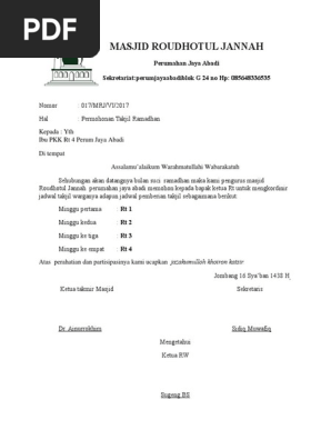 Misal pada usaha salon atau. 034PRMBtmnVIII09 Padaran 15 Agustus 2009. Dengan ini kami selaku Pengurus Rt 006 Rw 015 bermaksud memberitahukan kepada Bapak dan Ibu bahwa sehubungan dengan adanya kegiatan-kegiatan selama bulan suci ramadhan di Masjid An Nahl kami akan melakukan penarikan iuran dana takjil sebesar Rp.