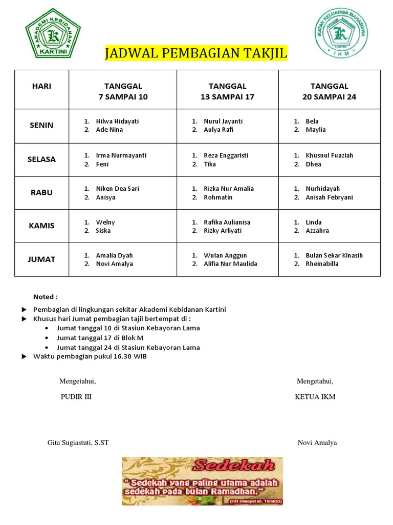 Takjil bisa berupa kurma kolak dan jenis. Sebagai contoh di minggu ini kamu kebagian jadwal hari Senin-Rabu dari jam 11 pagi sampai 5 sore. Harga Bahan Baku Melonjak Pas Ramadan.