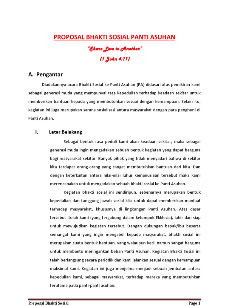 Kegiatan bakti sosial ini sendiripun sebenarnya merupakan bentuk kepedulian dan tanggung jawab sosial kita untuk dapat memberikan manfaat terhadap masyarakat khususnya di lingkungan panti asuhan. Puji syukur kehadirat Allah SWT yang telah mencurahkan rahmat-Nya kepada kita semua sehingga proposal kegiatan Bakti Sosial dapat terselesaikan. Contoh Proposal Gotong Royong dan Bakti Sosial Masjid di Daerah Pendahuluan Kegiatan yang dilakukan secara bersama-sama disebut sebagai gotong-royong sudah menjadi strategi dalam pola hidup bersama yang saling meringankan beban masing-masing pekerjaan.