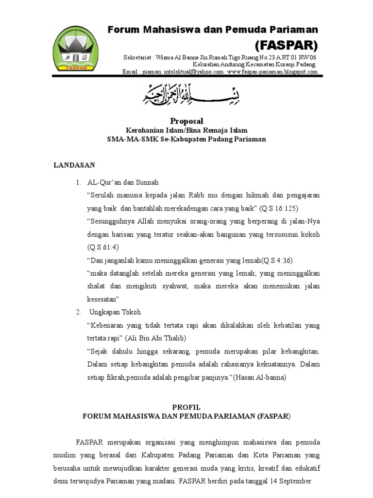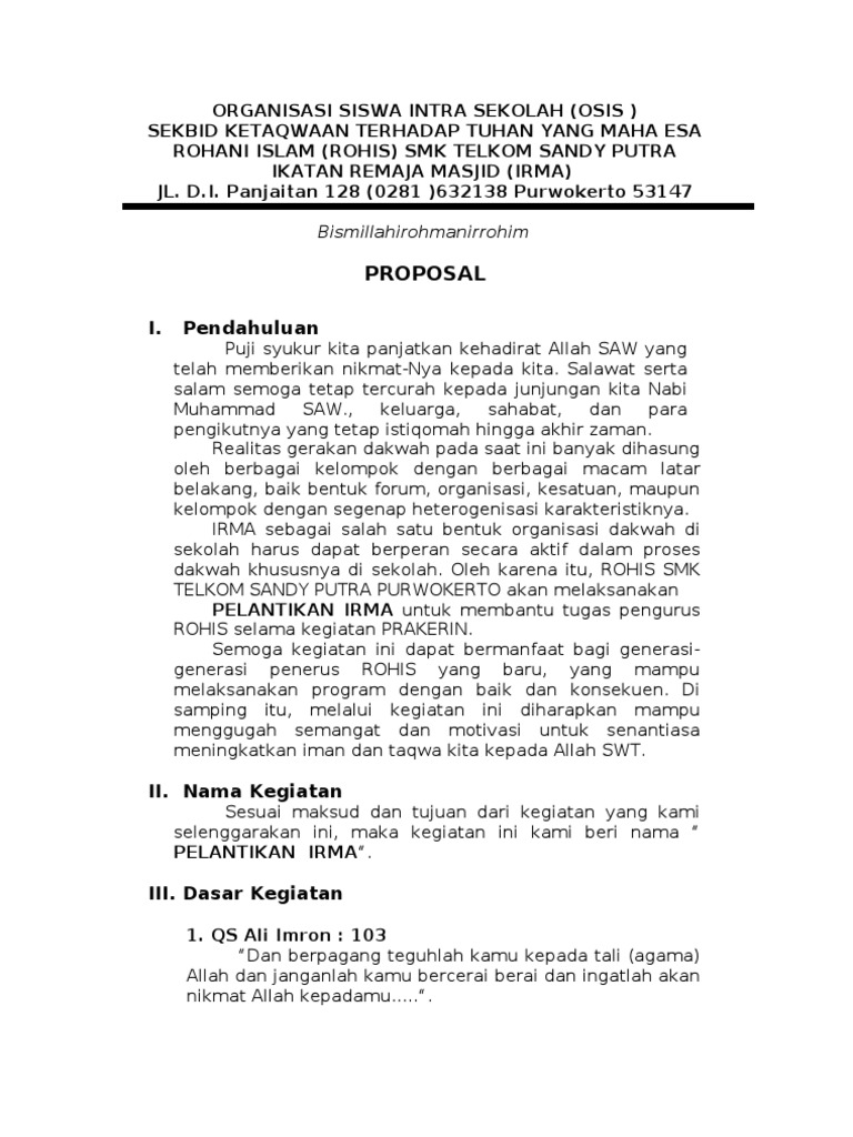 Semoga Allah SWT meridhoi langkah dan perjuangan kita bersama. Proposal Kegiatan Rohis DOC PROPOSAL ROHIS muhammad apri. MUQADDIMAH Segala puji hanya bagi Allah Subhanahu Wa Taala kami memujiNya memohon pertolonganNya dan ampunan serta bertaubat kepadaNya dari kejahatan jiwa-jiwa kami dan keburukan amal-amal kami.