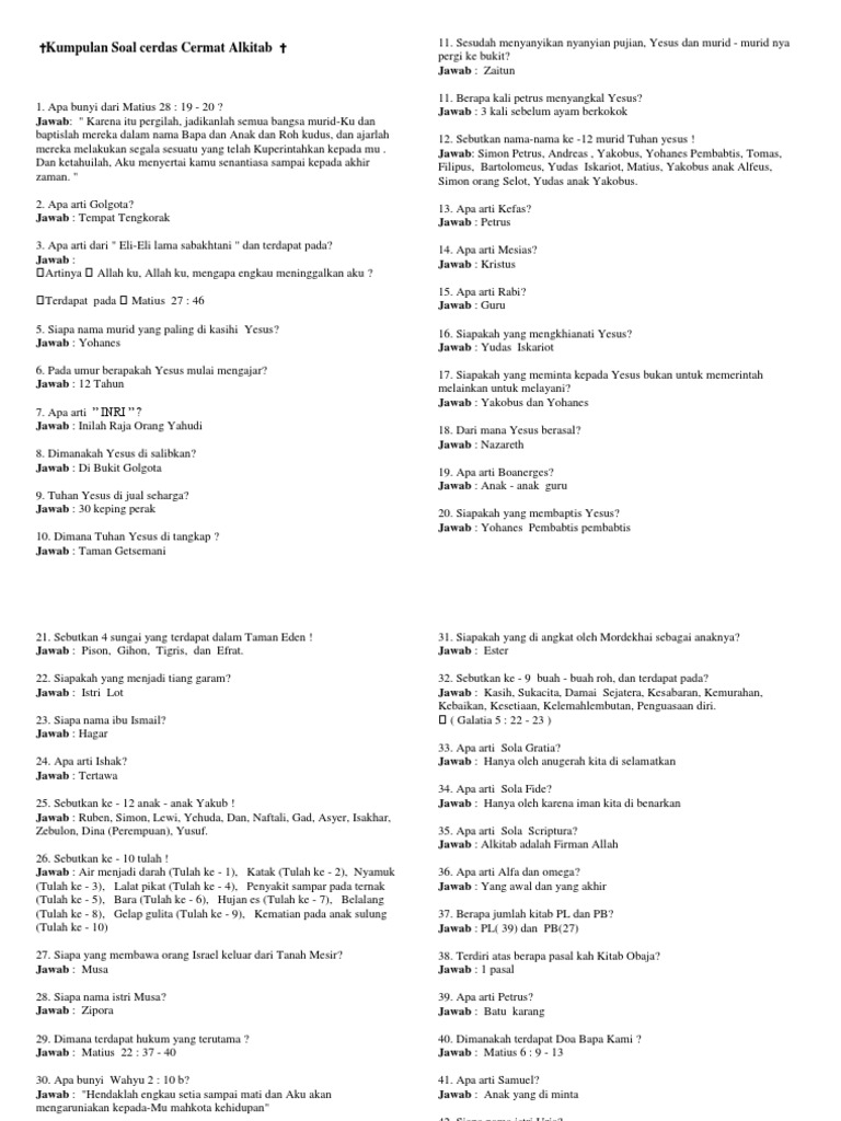Contoh Soal Cerdas Cermat Alkitab Anak Sekolah Minggu Tentang. Admin blog Contoh Soal Terbaru 2019 juga mengumpulkan gambar-gambar lainnya terkait contoh soal cerdas cermat alkitab anak sekolah minggu dibawah ini. SOAL WAJIB PENGUASAAN ALKITAB CERDAS CERMAT ALKITAB 1.