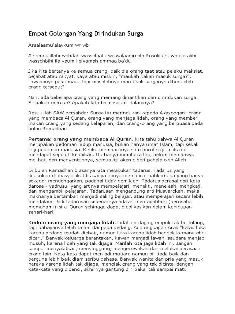 تا لى القران وحافظ اللسان ومطعم الجيعان وصا ئم فى شهر رمضان رواه أبوداود والترمذي عن ابن عباس. Namun ternyata ada 4 golongan manusia yang dirindukan surga. Surga itu merindukan kepada 4 gol yaitu 1orang yang suka membaca Alquran 2orang yang suka menjaga lisannya 3orang yang suka memberi makan kepada orang yang lapar 4.