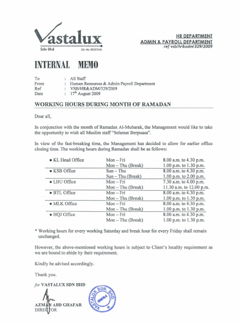 Memo Working Hours During Ramadan