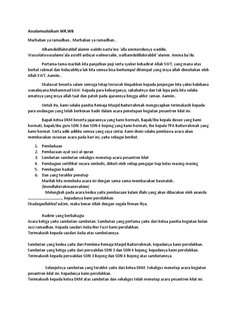 Sambutan penutupan ramadhan. Pondok Putra Pondok Putri As-Salam Al-Fatih An-Nur dan Al-Anwar. Pondok Ramadhan Hari Ketiga Jumat 07 Mei 20210845-1025 - Sambutan Doa dan Penutupan Kelas 7 8 9Kegiatan Peningkatan Iman dan Taqwa peserta didik. Bahkan tidur dari seseorang yang berpuasa pun dinilai.