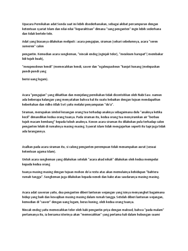 2 -Sajak Sunda Sama seperti master of ceremony MC kita sering mengucapkan Émsé atau Ngémsi padahal para ahli Bahasa Sunda sudah memperkenalkan dengan istilah Panata Acara atau Panata Calaraga. Pernikahan dipandang bukan hanya peristiwa penyatuan dua insan namun juga sebuah peristiwa budaya. Siraman dilakukan oleh 9 orang sesepuh termasuk sang Ayah.