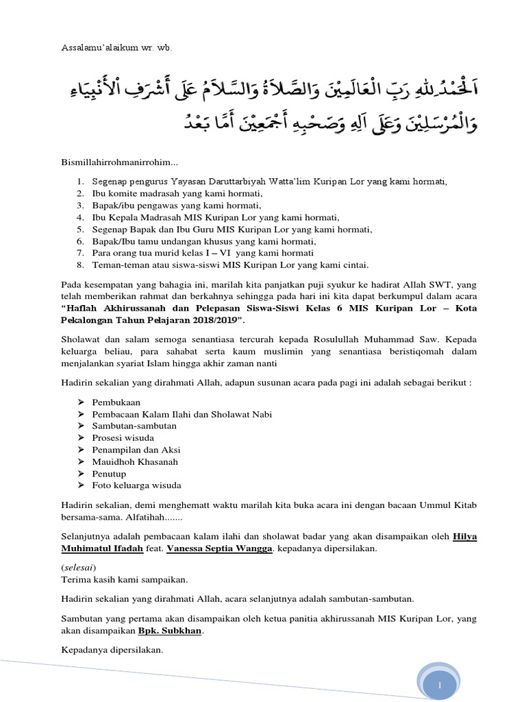 Kepada keluarga beliau para sahabat serta kaum muslmin yang senantiasa beristiqomah dalam menjalankan syariat Islam hingga akhir zaman nanti. Teks pembawa acara akhirussanah pondok pesantren.