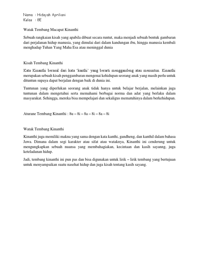 Kesebelas tembang macapat itu menggambarkan perjalanan kehidupan manusia. Tembang Kinanthi berisikan bimbingan atau tuntunan yang dilakukan oleh orang dewasa kepada anak-anak. Contoh Arti Makna Watak Aturan Terlengkap.