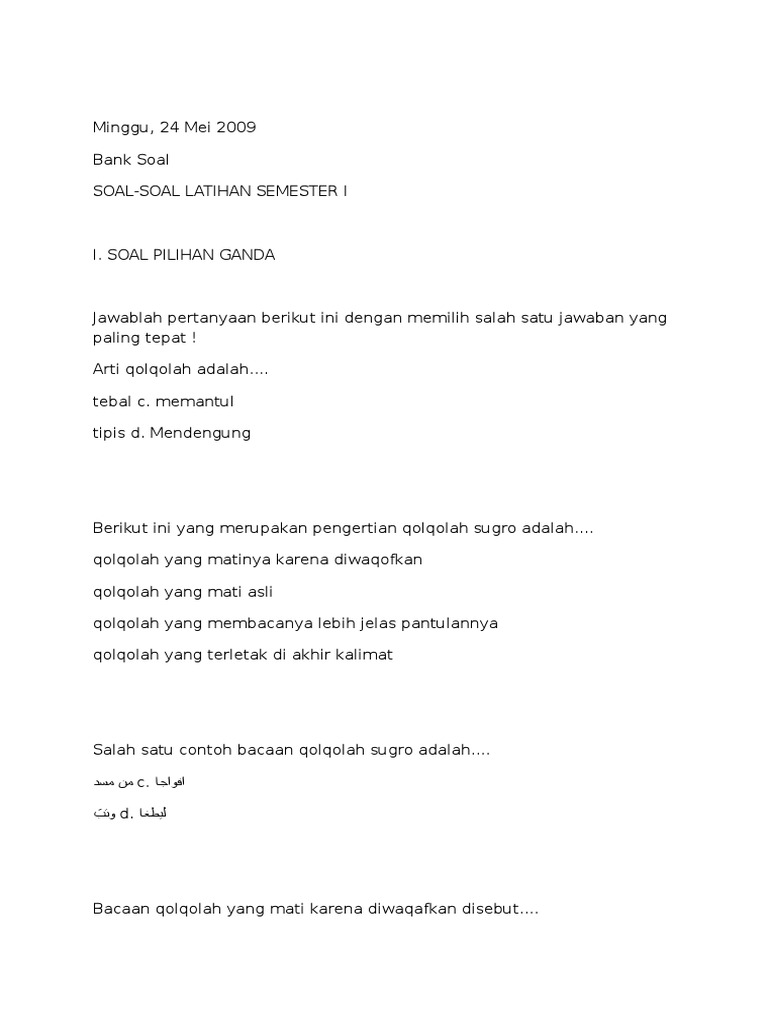 Soal Tajwid Pilihan Ganda Dan Jawabannya Ilmusosial Id from wwwilmusosialid. Contoh soal bahasa indonesia pg kelas 12 xii sma ma smk dan kunci jawabannya pada kesempatan kali ini materi bindo akan membagikan kumpulan contoh soal pilihan ganda bahasa indonesia kelas xii 12 semester 1 beserta jawabannya. Doc Soal Syafahi Tajwid Akhir Tahun Handika S Tumanggor.