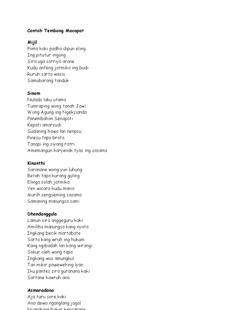 Masa-masa mengenal lingkungan serta pergaulan. Lirik Lagu Tembang Macapat Kinanthi Aviesta S Blog. Contoh Tembang Kinanthi dan Wataknya - Setiap tembang macapat memiliki ciri khas yang bisa menjadi pembeda antara tembang yang satu dengan lainnya.