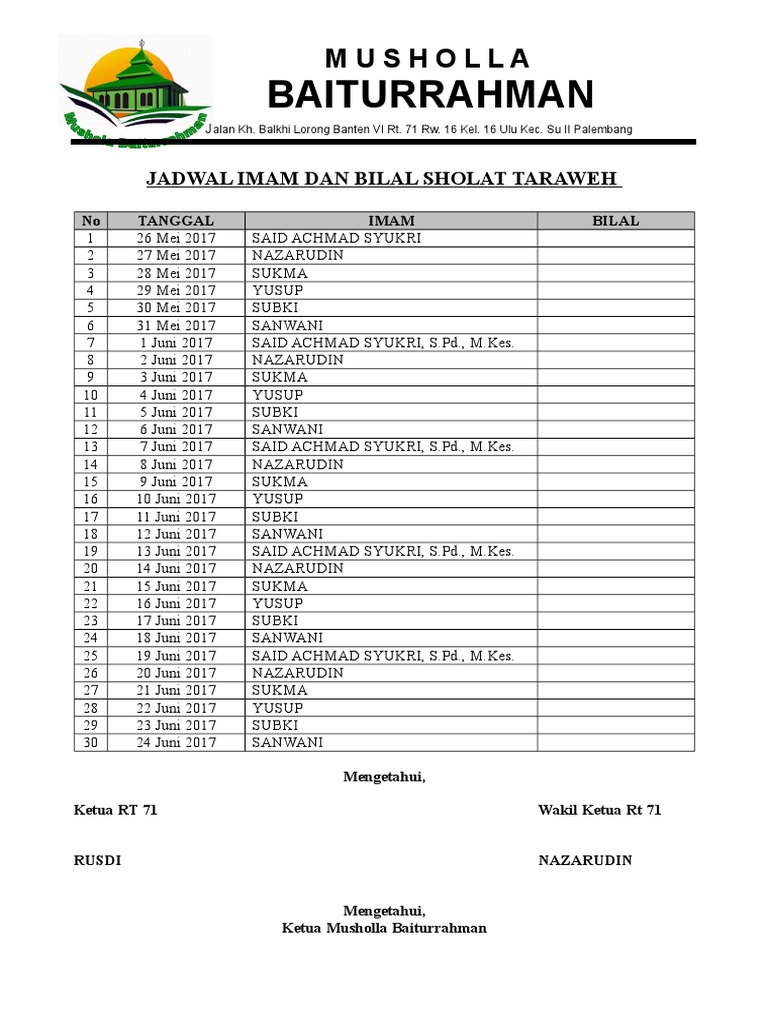 Jadwal Imam Dan Bilal Sholat Tarawih Ramadhan 1439 H Mnj Dkm Nurul Jannah Rw40 Griya Asri Bahagia