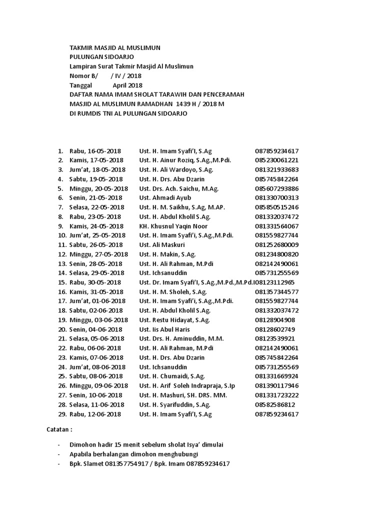 Daftar imam sholat tarawih. Sholat malam Kategori. Jadwal Imam Sholat Tarawih dan Bilal Bulan Ramadhan 1441 H Mahad Jamiah IPMAFA. Kelurahan mentaos banjarbaru utara tanggal imam 24 ramadhan jarkani 25 ramadhan zainuddin 1 ramadhan zainuddin 26 ramadhan zainuddin 2 ramadhan zainuddin 27 ramadhan zainuddin 3 ramadhan zainuddin 28 ramadhan syaifuddin 4 ramadhan syaifuddin 29 ramadhan syaifuddin 5 ramadhan syaifuddin 30 ramadhan.