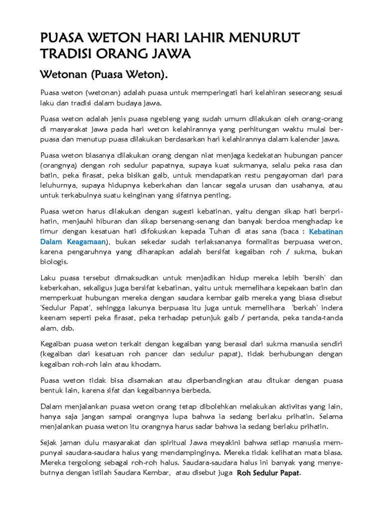 Usaha dan doa janma manungsa. Cara mengerjakan puasa weton untuk pengasihan ini dimulai dari niat dan diakhiri dengan membaca beberapa wirid doa. Weton adalah perayaan hari kelahiran berdasarkan perhitungan kalender Jawa.