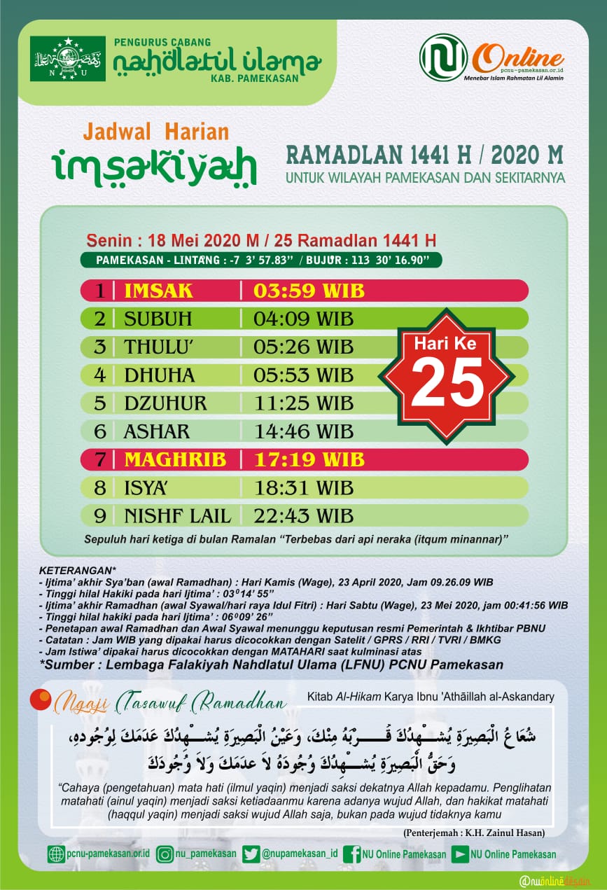 Nu Online Pamekasan On Twitter Jadwal Harian Imsakiyah Untuk Wilayah Kab Pamekasan Hari Kedua Puluh Lima Senin 18 Mei 2020 M 25 Ramadhan 1441 H Panitiasyiarramadhanpcnupamekasan Pcnupamekasan Https T Co Mtc4xkgoue