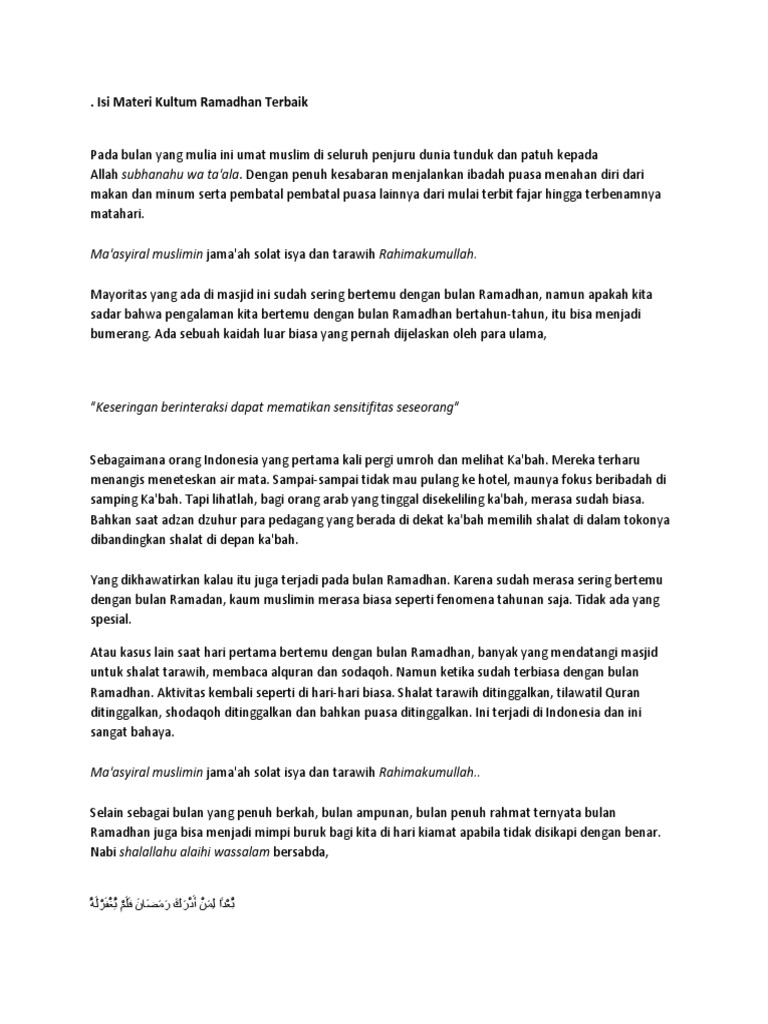 Inilah 47 materi kultum Ramadhan untuk anda. Subhanallah Jamaah sekalian rahimakumullah. Ramadhan datang membawa kunci-kunci ampuna.