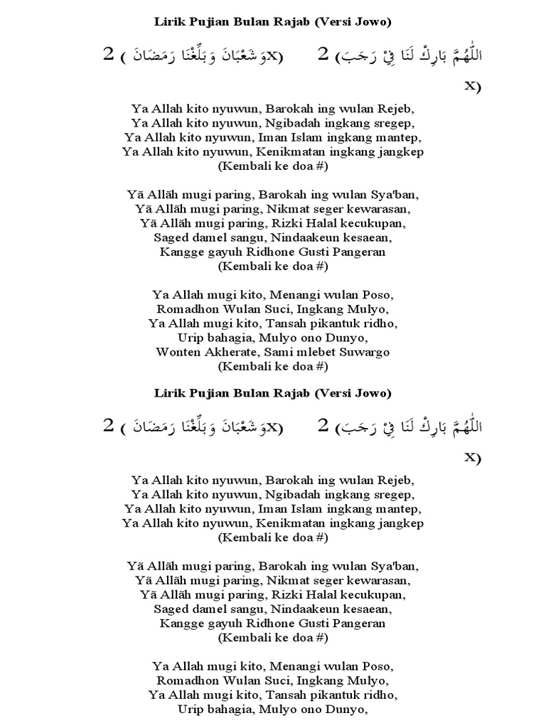 2x Back Ya Allah kito nyuwun Barokah ing wulan Rejeb Ya Allah kito nyuwun Ngibadah ingkang sregep Ya Allah kito nyuwun Iman Islam ingkang mantep Ya Allah kito nyuwun Kenikmatan ingkang jangkep Back. Puasa sehari dalam bulan Rajab seumpama puasa empat puluh tahun dan iberiminum air dari syurga. Untuk mendapatkan keistimewaannya ada doa bulan Rajab bisa diamalkan.