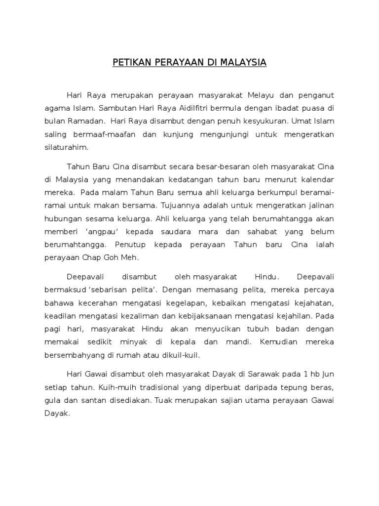 Ia merupakan ibadah yang berbentuk niat dalam hati dan berbeza dengan semua amalan lain yang boleh dilihat oleh mata orang lain dan tidak lepas daripada syirik riya ujub serta takkabur. Contextual translation of karangan tentang hari raya puasa into English.