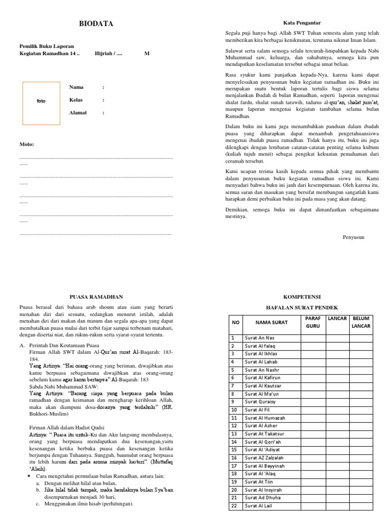 Syukur alhamdulillah bulan Ramadhan 1437 H sudah di depan mata. PERENCANAAN KEGIATAN Perencanaan kegiatan 2 BAB III. Pada Buku yang kami sajikan inipun termuat beberapa isian dan paling umum di gunakan seperti mulai dari catatan untuk isi biodata cover kata pengantar penjelasan tentang puasa ramadhan serta catatan-catatan laporan yang harus di isi dalam kegiatan pesantren kilat.