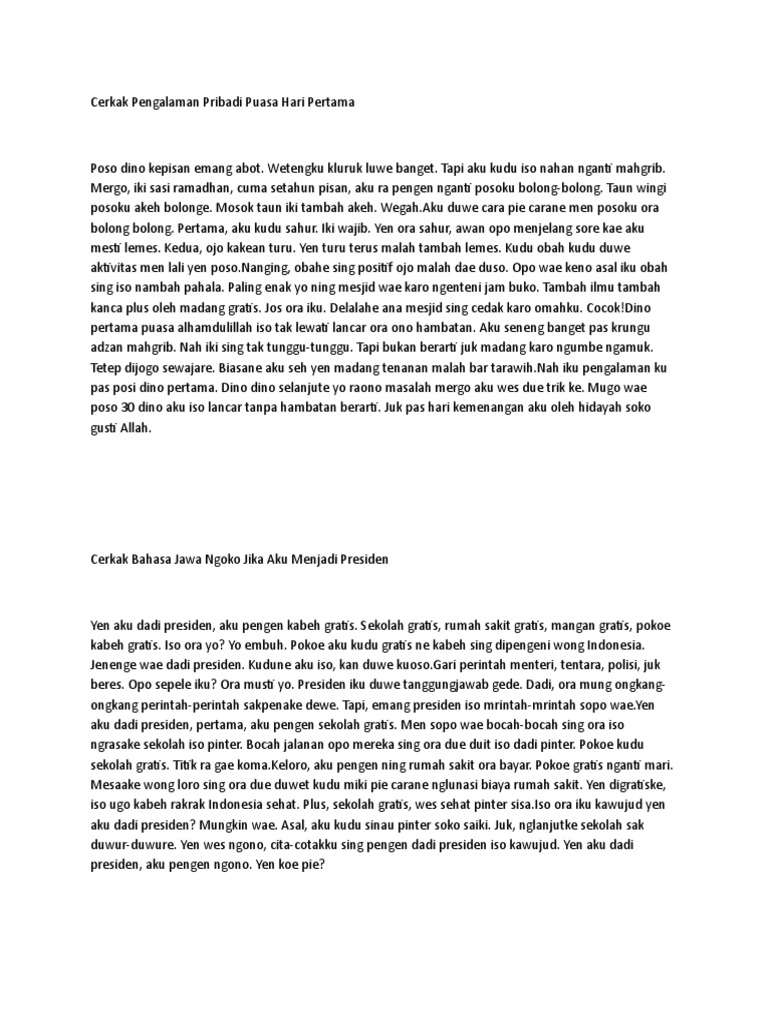 Kumpulan cerkak pengalaman pribadi bahasa jawa 2016 Bagi teman-teman yang sedang mencari contoh cerita pendek berbahasa jawa di bawah ini kami himpun kumpulan cerkak pengalaman pribadi bahasa. Cekak bahasa jawa pengalaman pribadi lomba 17 Agustus. Saat liburan sekolah usai dalam pelajaran Bahasa Jawa para siswa akan di mintai untuk menceritakan pengalaman pribadi selama liburan.