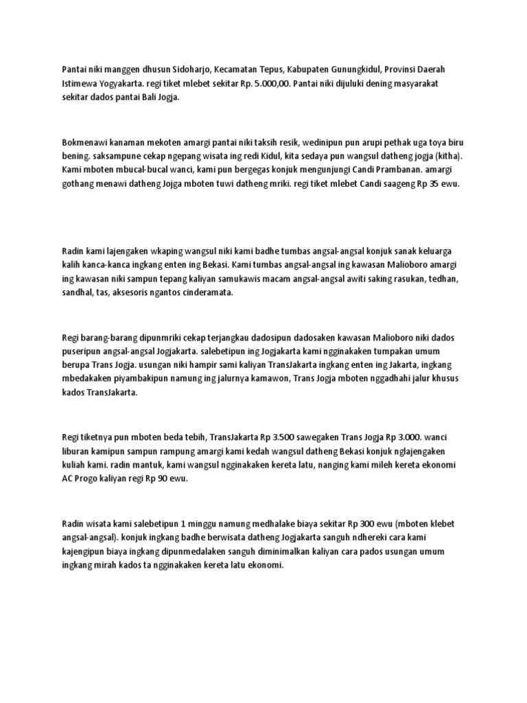 Cerkak bahasa jawa pengalaman pribadi. Buat teman-teman yang nanti akan mengikuti upacara bendera dalam rangka memperingati hari Kemerdekaan Republik Indonesia yang ke-71 pasti bisa juga menceritakannya dalam tulisan serupa. Admin dari blog Temukan Contoh 2019 juga mengumpulkan gambar-gambar lainnya terkait contoh cerkak bahasa jawa tentang pengalaman pribadi dibawah ini. Pengalaman pribadi ini sengaja disajikan dalam sebuah cerita bahasa jawa plesiran atau liburan yang dilakukan bersama keluarga sewaktu libur sekolah.