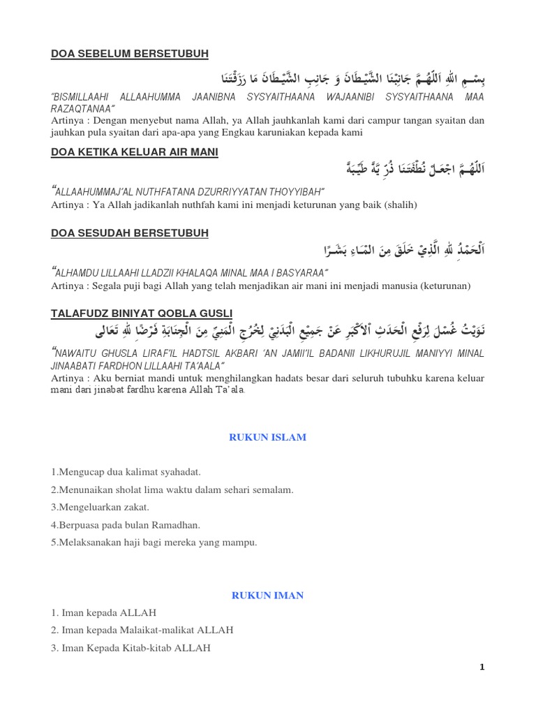 Lafal doa tersebut adalah. Setelah melaksanakan hubungan intim dengan suami dan istri umat Islam diharuskan melakukan komitmen wajib yang disebut mandi wajib. Bahwasannya mani itu setingkat dengan ingus dan ludah cukuplah bagimu menyapunya dengan percikan air atau idzkhirah sebangsa rumput wangi Jika dalil-dalil tersebut dengan jelas menerangkan kesucian mani dan kewajiban mandi karena keluar mani tetapi dalil-dalil itu belum menggambarkan adanya hubungan sebab-akibat keluar mani yang suci mengakibatkan wajib mandi.