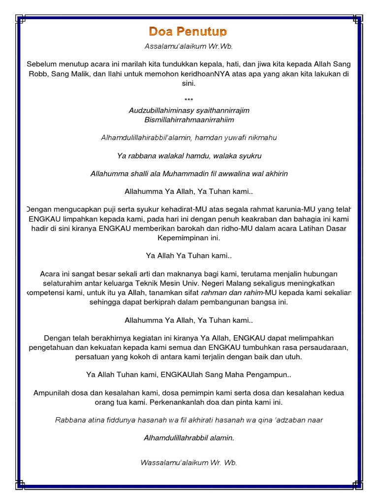 Doa penutup acara adalah suatu peristiwa atau kegiatan umumnya harus ditaati sedemikian rupa sehingga dapat berjalan dengan baik dan lancar dalam hal tersebut dapat dilaksanakan setelah. Doa Mohon Keselamatan Bangsa Dan Negara. Doa Penutup Acara Berikut ini adalah materi tentang doa penutup acara doa pembuka acara keutamaan berdoa di akhir acara serta adab dalam berdoa dengan penjelasan yang lengkap.