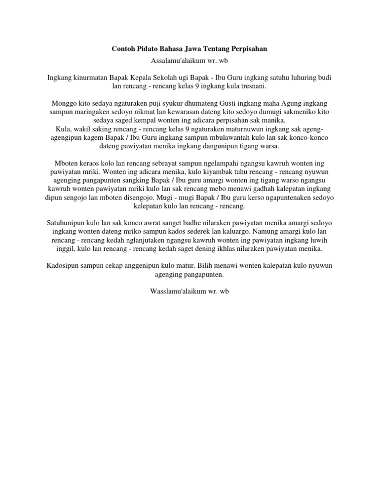 14 contoh pidato bahasa jawa tentang pendidikan perpisahan sekolah tausyiah agama acara halal bil halal sumpah pemuda nasionalisme ramadhan lingkungan. Kito penuhi mawi kegiatan-kegiatan tadarrus Al-Quran Shodaqoh dateng fakir miskin lan sanes-sanesipun. Ingkang kaping kalihipun mugiho Rahmat lan Salam Bahagia Alloh selalu.