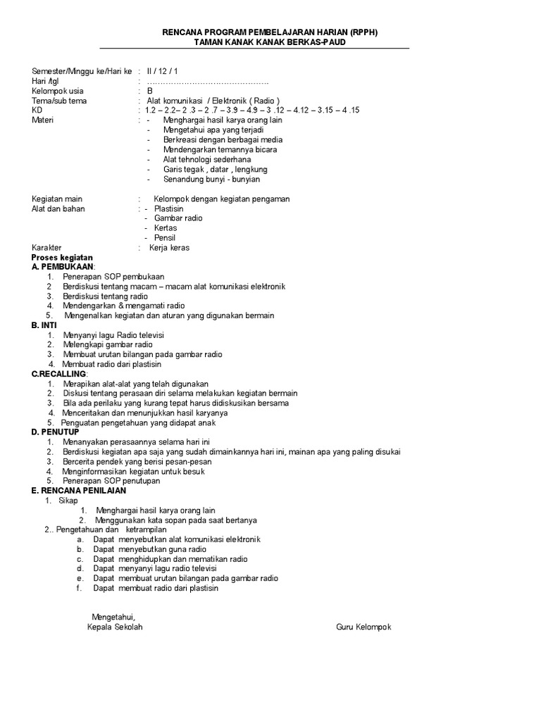 Contoh Rkh Dan Rkm Paud Ra Tk Kurikulum 2013 Rkh Kelompok A