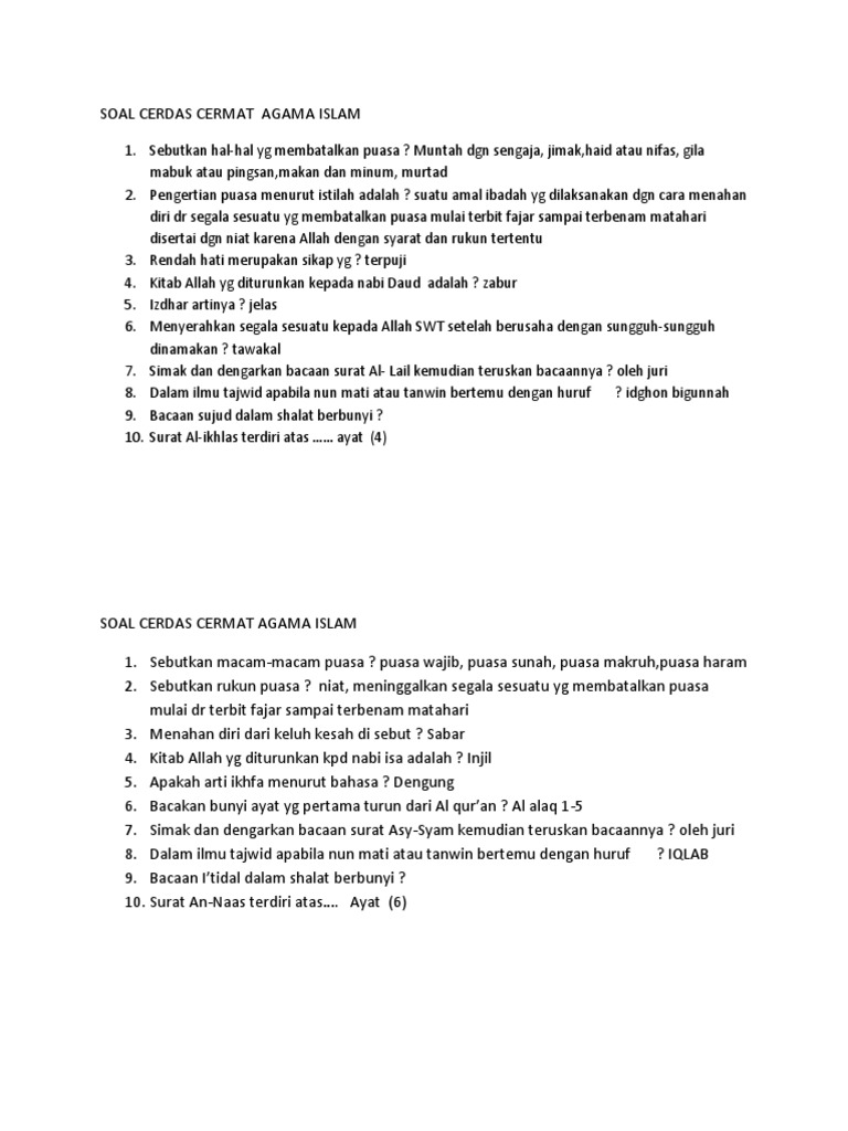 Soal dan Jawaban Cerdas Cermat Agama Islam. Puasa yaitu menahan diri dari makan dan minum serta dari segala hal yang sanggup membatalkan puasa dari. 45Abu Bakar mendapat julukan ash shidiq yang bermakna.