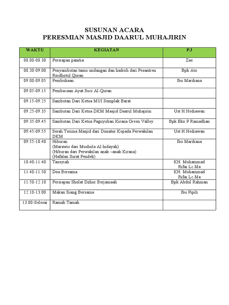 Susunan Acara Peresmian Masjid Daarul Muhajirin