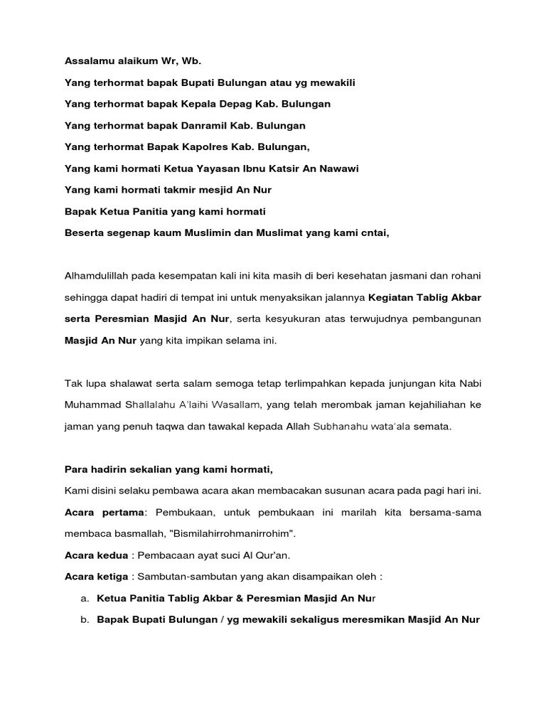 Sekretariat Daerah Kabupaten Aceh Tamiang BAGIAN HUMAS 2 Assalamualaikum Warahmatullahi Wabarakatuh alhamdulillahirabbilalamin wassalatuwassalamuala asryafil ambia-iwalmursalin waala alihi wasahbihi ajmain. Gubernur Jawa Tengah Bapak Bibit Waluyo Yang kami hormati Rektor Universitas Negeri Semarang Bapak Sudijo Sastroatmodjo Yang kami hormati Dekan Fakultas Bahasa dan Seni Bapak Rustono Bapak-bapak. Sama seperti sebagian besar acara-acara peresmian lainnya susunan acara peresmian masjid juga diawali dengan bagian pembukaan.