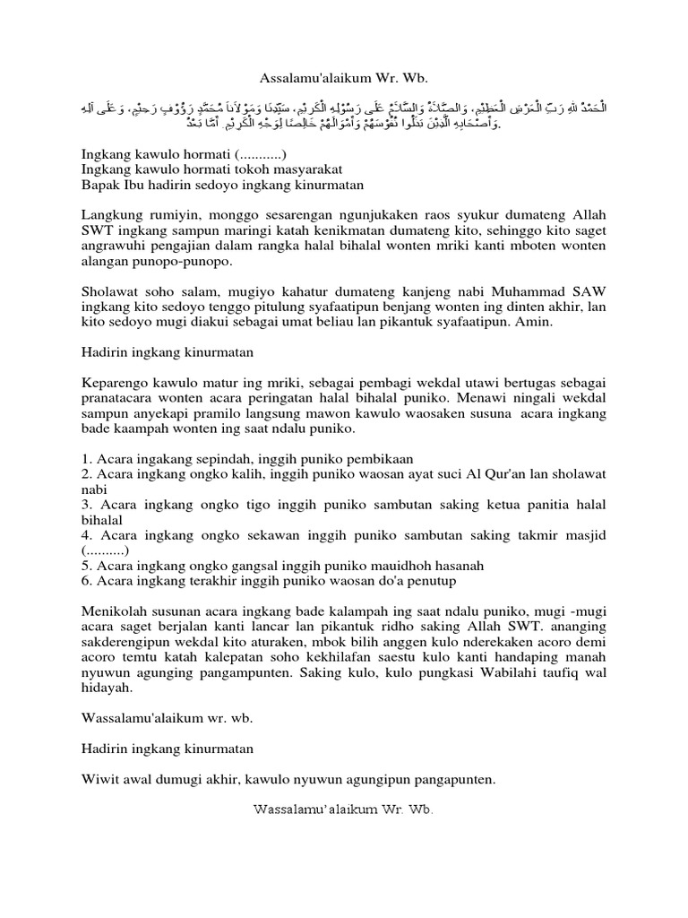 Hamdan wa syukran lillah wasshalatuwassalamuala Rasulillah ala sayyidina muhammadin waala alihi washahbihi ajmain amma bad. Contoh teks MC halal bihalal bahasa Jawa singkat. Khususnya dalam acara halal bihalal dalam rangka memperingati Hari Raya Idul Fitri 1433 Hijriyah yang berbahagia ini dan yang juga bertepatan dengan bulan kemerdekaan RI.