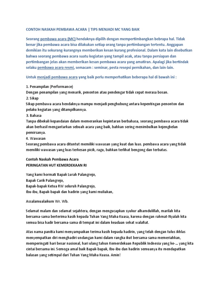 Berikut contoh teks MC. Terima kasih telah berkunjung ke blog Terkait Teks 2019. Acara diadakan secara resmi atau semi resmi yang terdiri dari panitia seksi-seksi serta susunan acara.