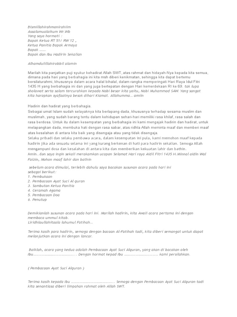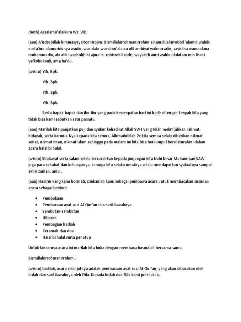 Teks MC Halal bi Halal dukuh Krangganan. 15 Full PDFs related to this paper. Karena dalam kehidupan kita tidak jauh dari sebuah kesalahan baik salah dengan diri sendiri maupun dengan orang lain maka oleh sebab itulah diakan acara halal bihalal.