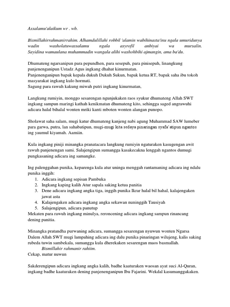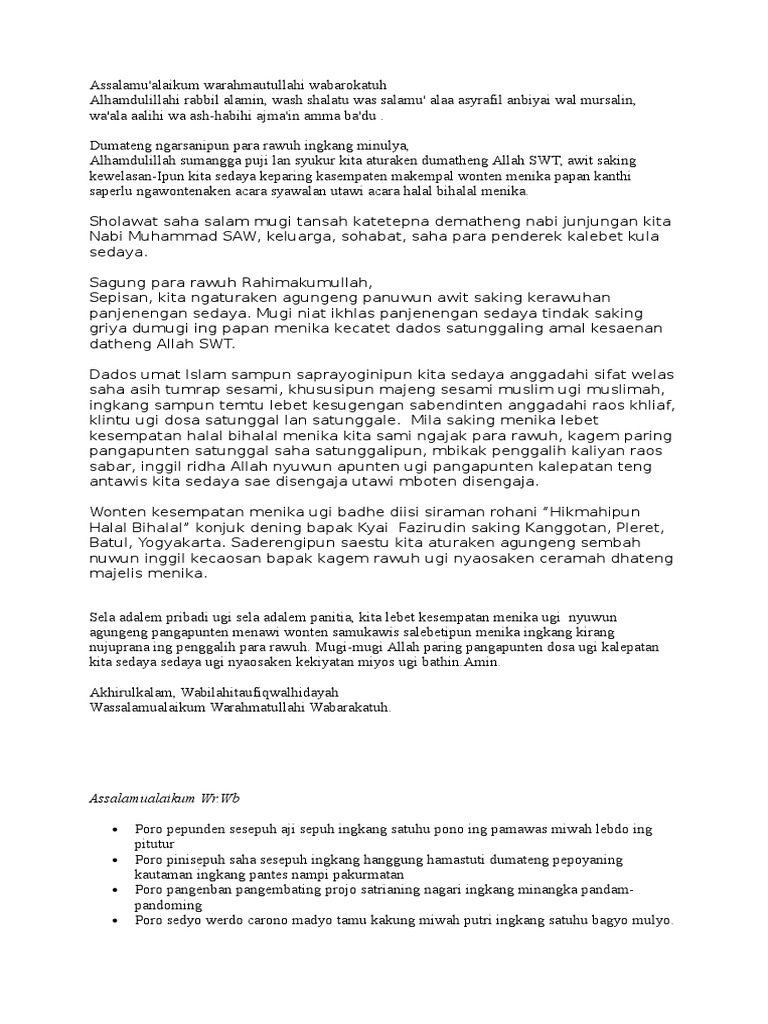 Admin blog Berbagai Teks Penting 2019 juga mengumpulkan gambar-gambar lainnya terkait teks pembawa acara halal bihalal idul fitri bahasa jawa dibawah ini. Yang terhormat Ustad Moh. Bismillahirrohmanirrohim alhamdulillahirobil alamin wabihi nastanginu ala umuridunya wadin wassalamuala sayidina muhammadin waala alihi wasohbihi wabarik wasalim ajmain amabadu.