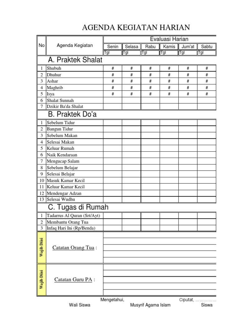 Format Agenda Ubudiyyah Harian Siswa Tinggal Diprint Aja Ok 2 Hj Wisnetty