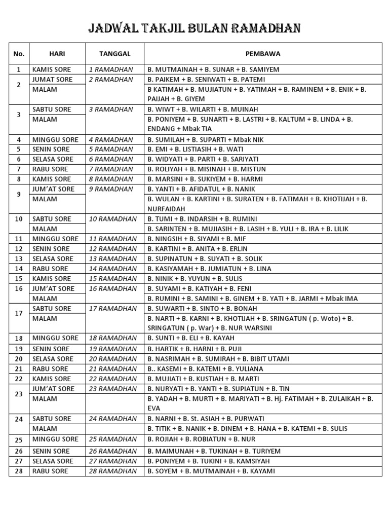 Contoh jadwal takjil ramadhan. Jadwal imam sholat tarawih bulan ramadhan 1432 h. Contoh Daftar Jadwal Pembawa Takjil Menu Untuk Buka Puasa Bulan Ramadhan. Kegiatan Ramadhan yang diselenggarakan oleh ramaja masjid yang terhimpun dalam forum remaja masjid al-fajr dan at-taufiq FoRMAT adalah sebuah kegiatan yang kami adakan hanya di bulan Ramadhan.