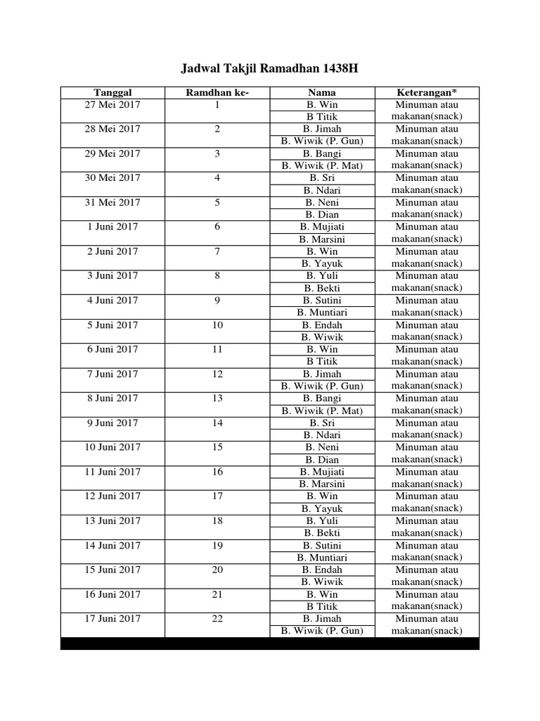 Hadirnya bulan ramadhan sangat dinantikan. Share Embed Jadwal Takjil Ramadhan 1438H Please copy and paste this embed script to where you want to embed. Skip to main content.